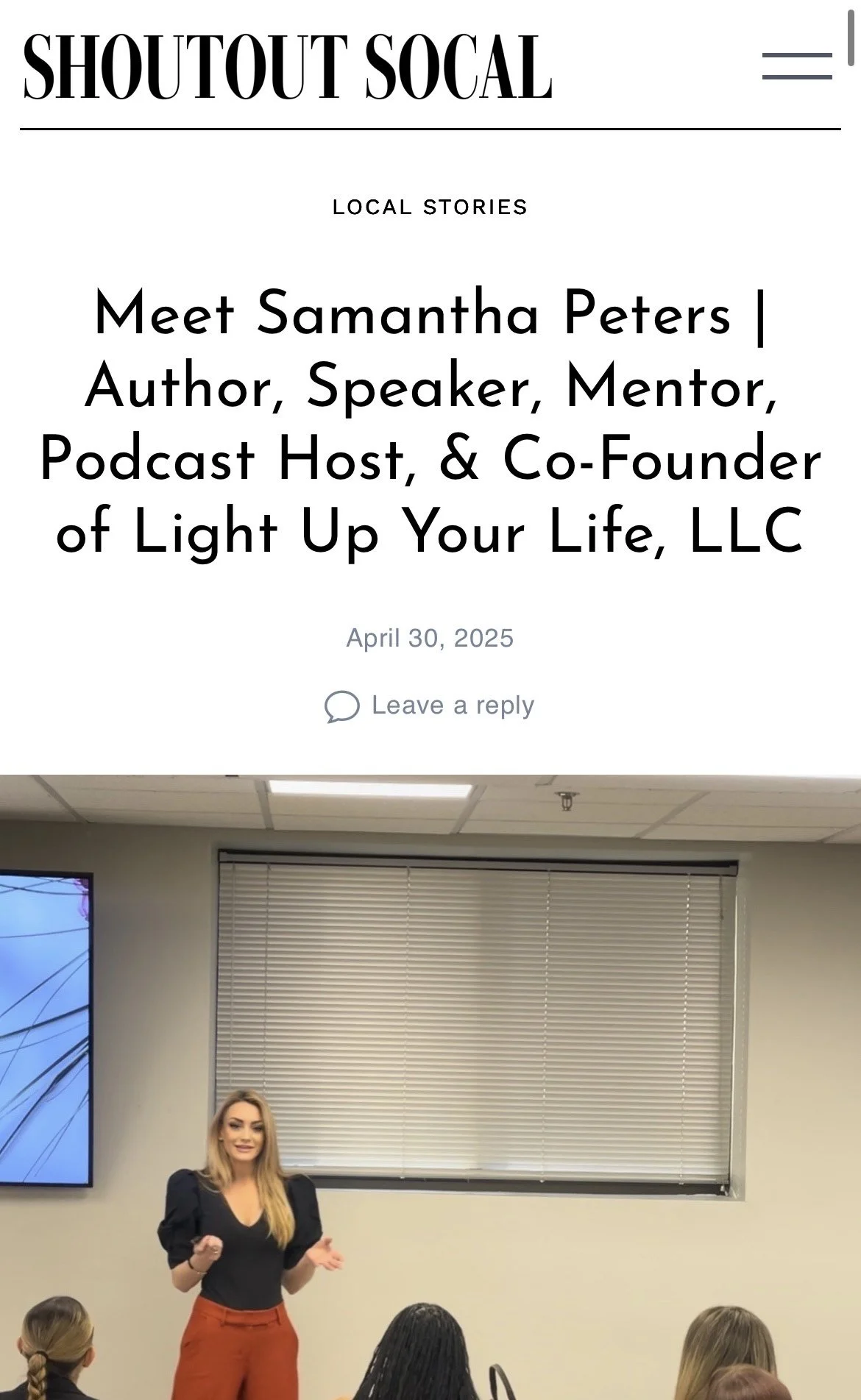 Samantha was also featured by Shoutout SoCal in “Meet Samantha Peters | Author, Speaker, Mentor, Podcast Host & Co-Founder of Light Up Your Life, LLC” where she opens up about growing up in a home filled with trauma and scarcity, overcoming obstacles and stepping into her mission of helping others heal and thrive.